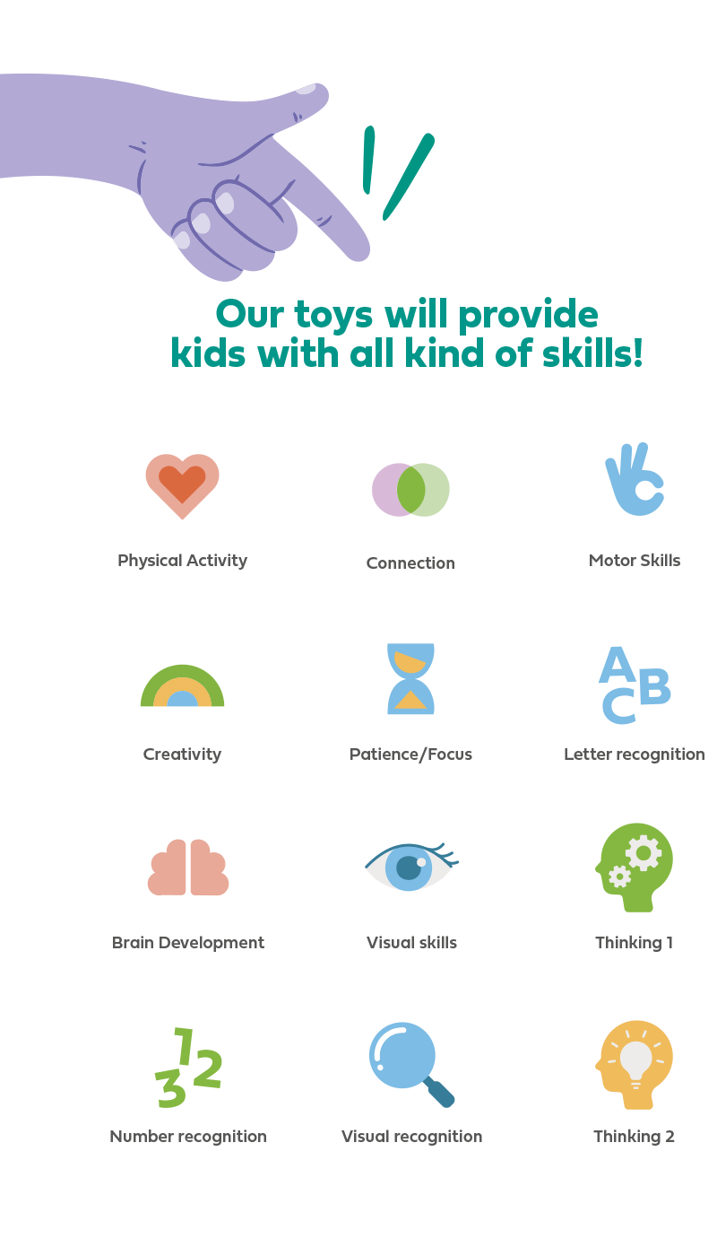 Een kind ontwikkeld zich door te spelen. Voor BS toys is het daarom belangrijk om de voordelen, voor de ontwikkeling van het kind, van ieder spel duidelijk te vermelden. Hiervoor hebben wij een iconen set ontwikkeld dat aansluit bij het speelse en optimistische design.