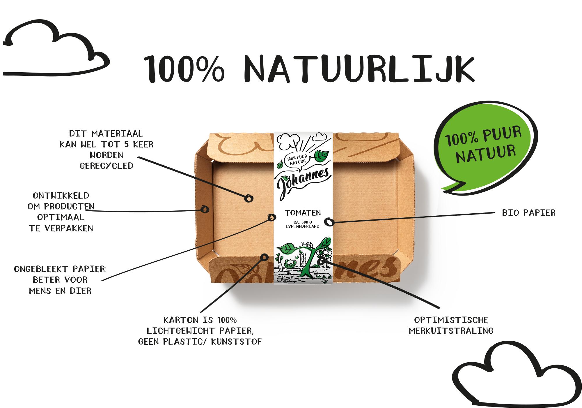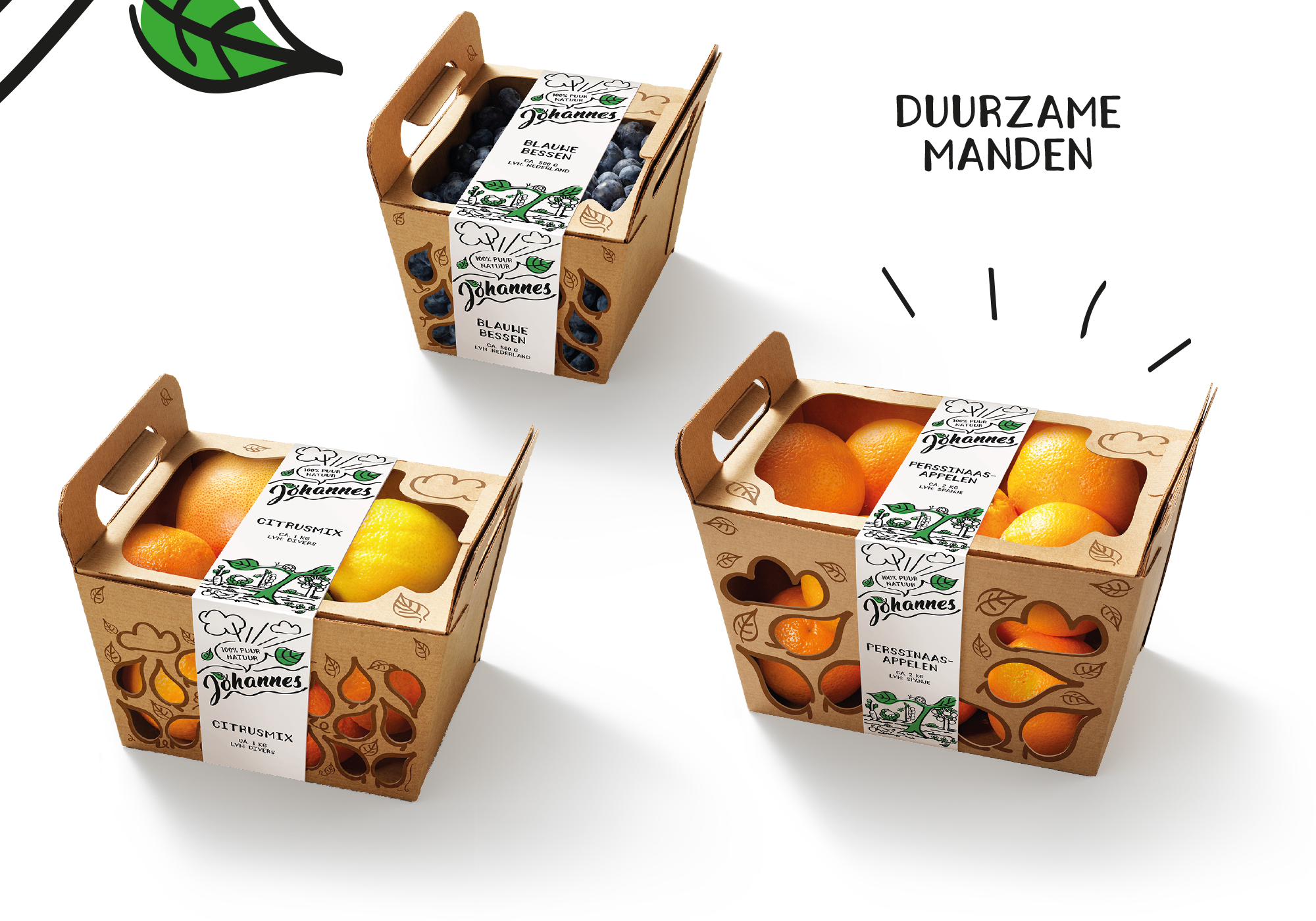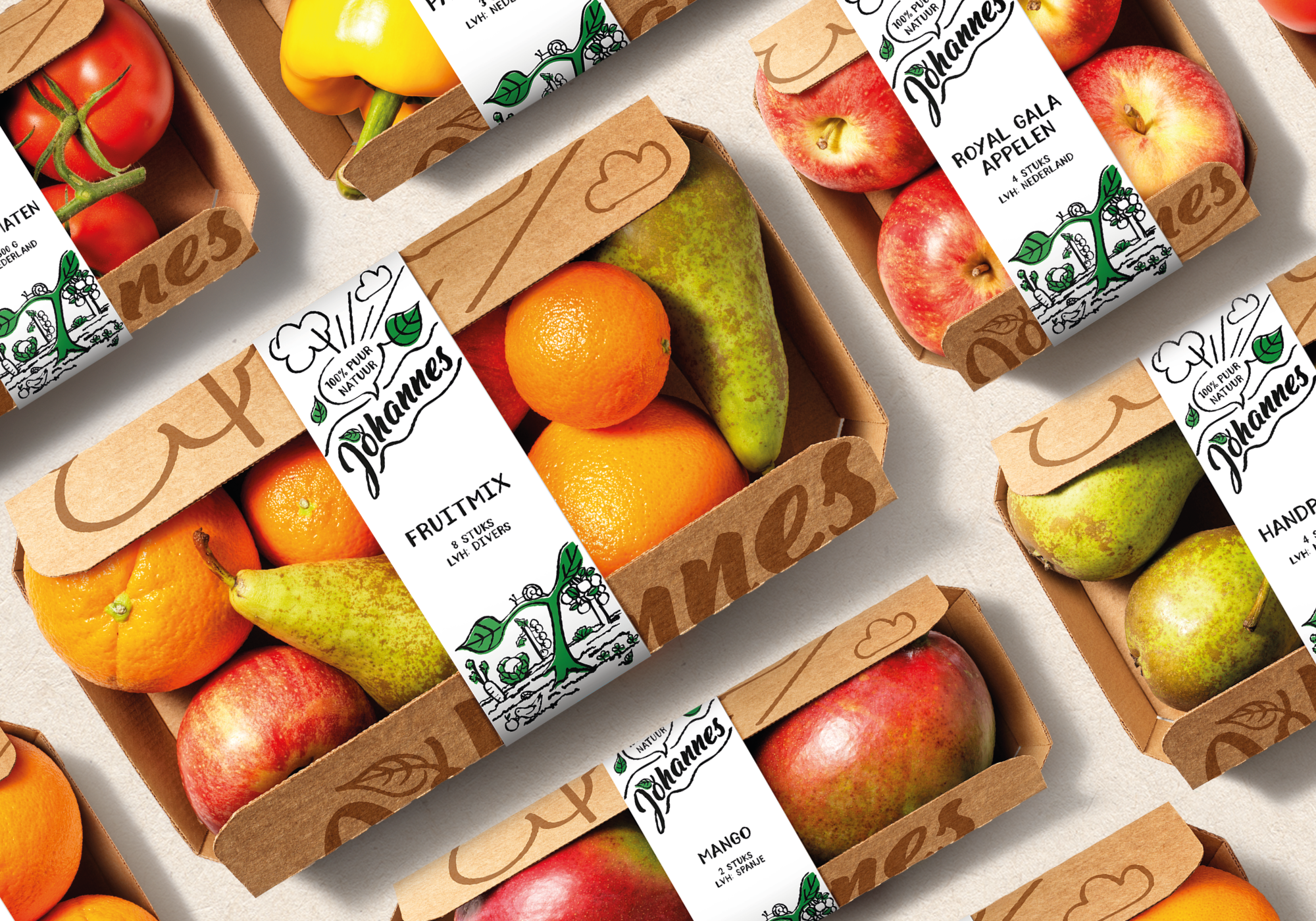 De kraft-kleurige doosjes zijn voorzien van een simpele banderol en eenvoudige, sympathieke illustraties. Het logo van Johannes is vriendelijk, optimistisch en persoonlijk. Door gebruik te maken van slechts twee drukgangen behouden de verpakkingen van Johannes hun puurheid en toegankelijkheid.