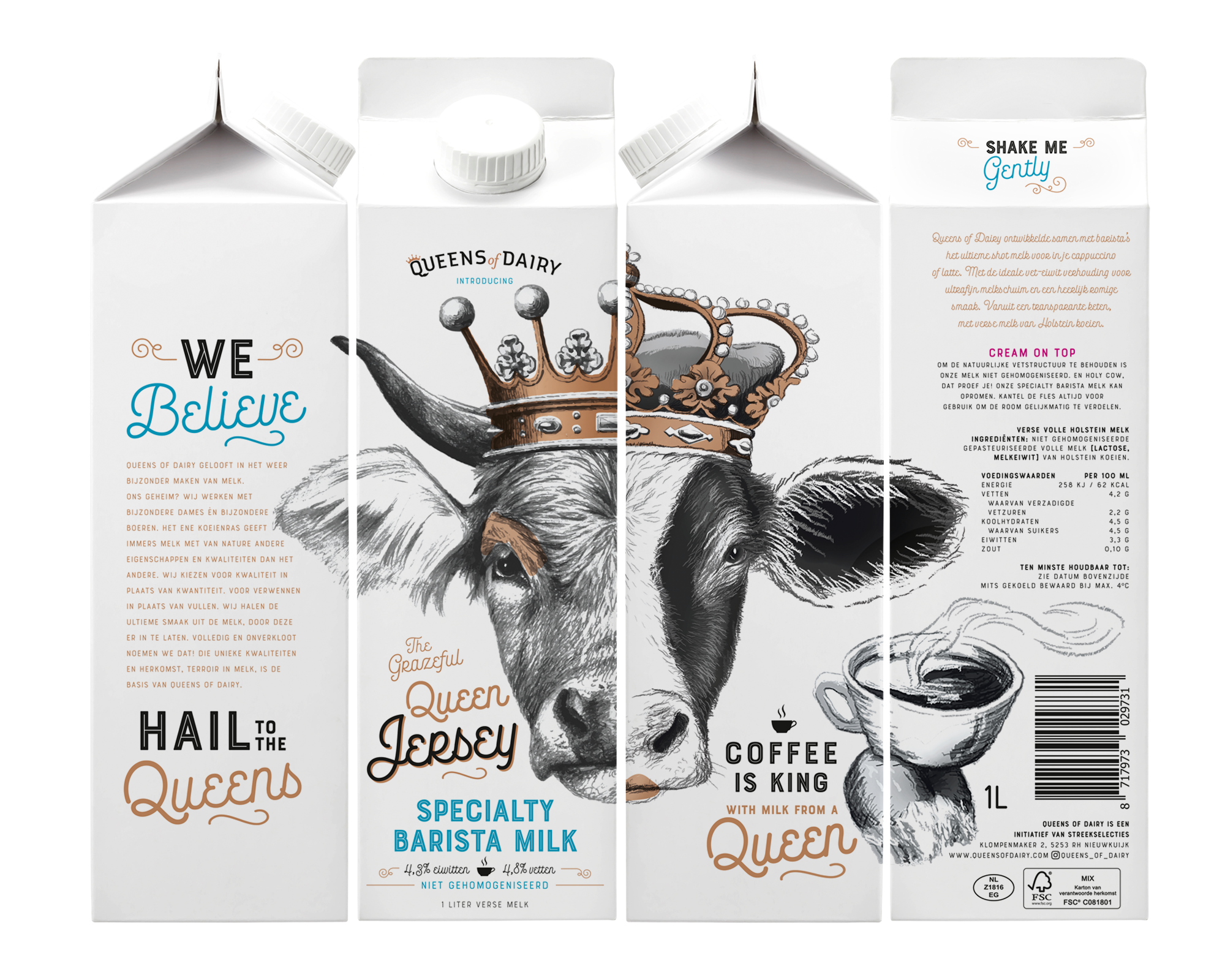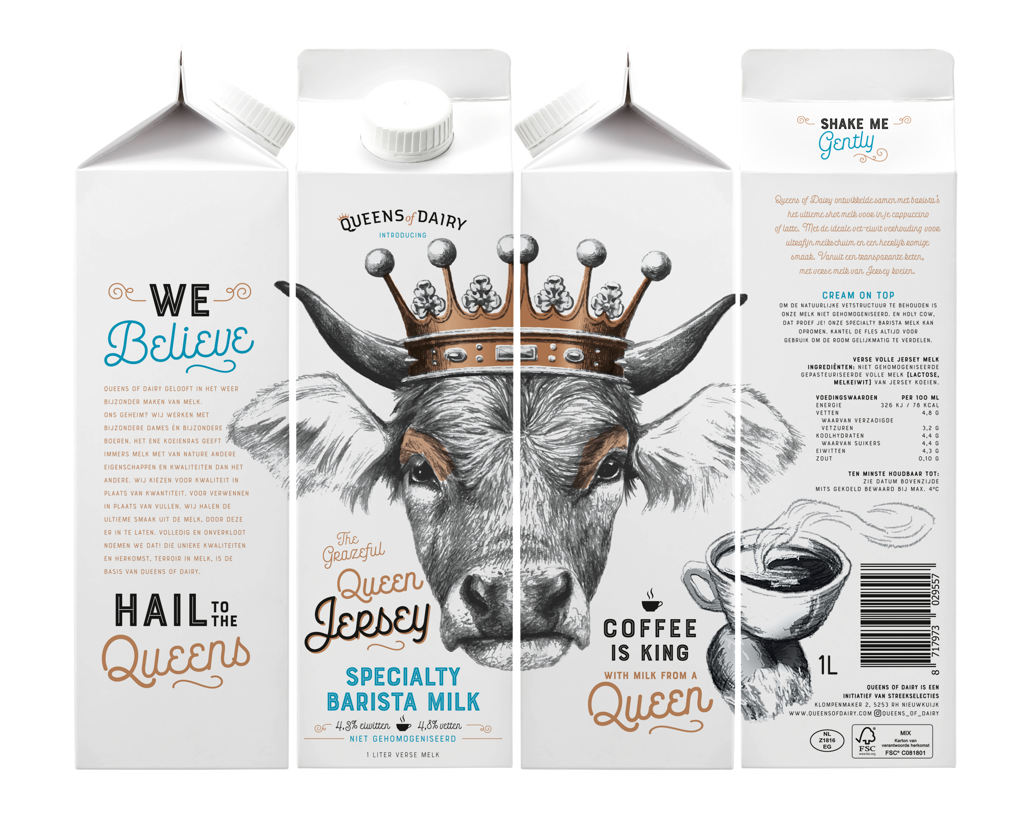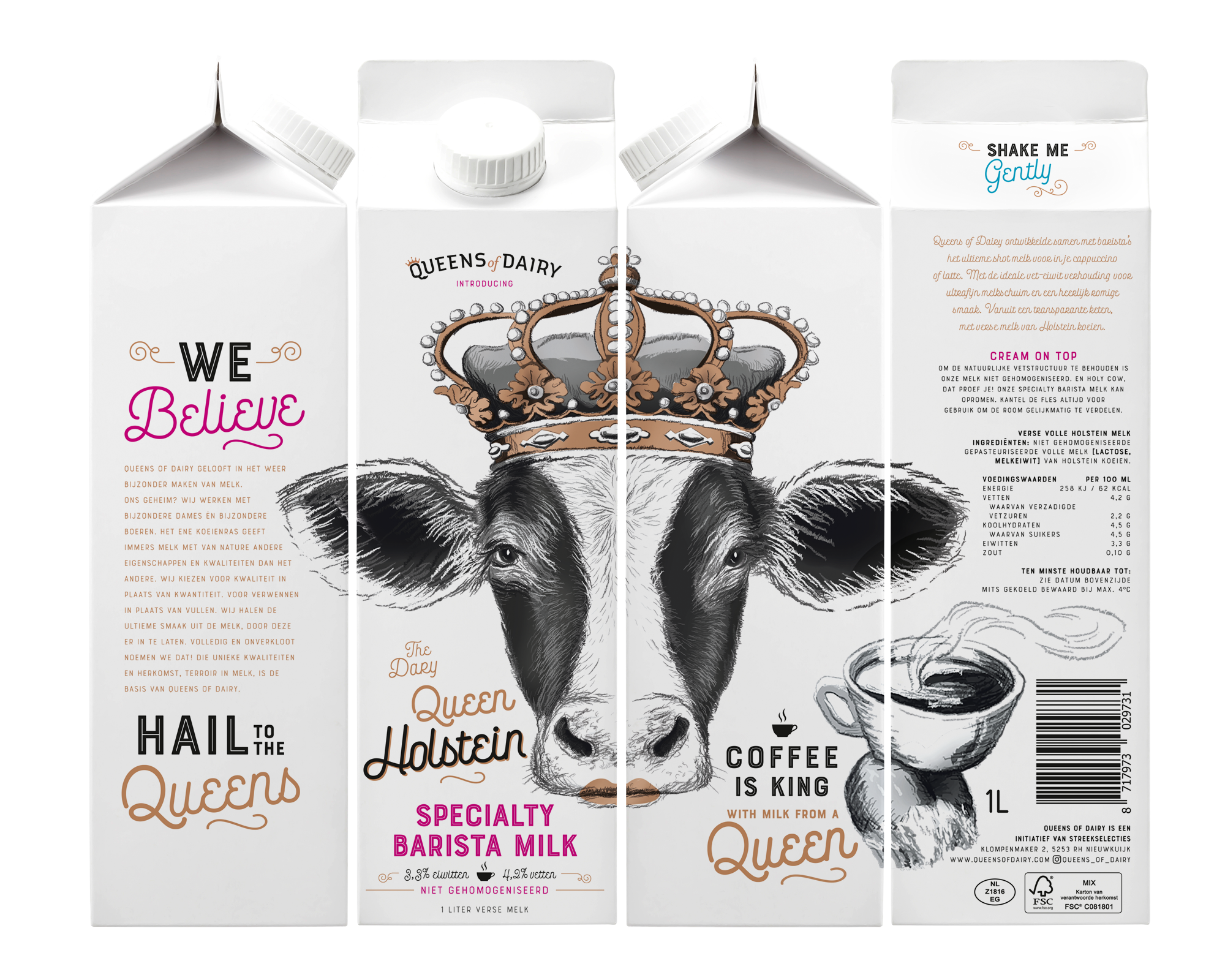 Vanuit de gedachte dat de koeien de koninginnen zijn van het vloeibaar witte goud ontwikkelden wij naam, identity, verpakkingen, de look and feel van de website en een beursstand. Onderscheidend en uitgesproken design voor onderscheidende melksoorten.