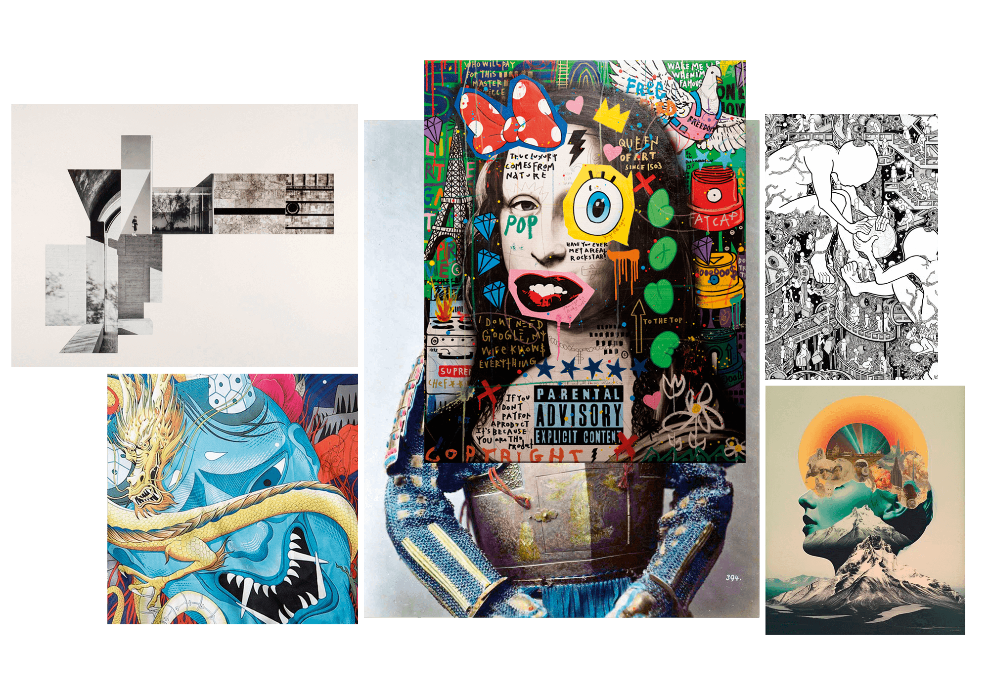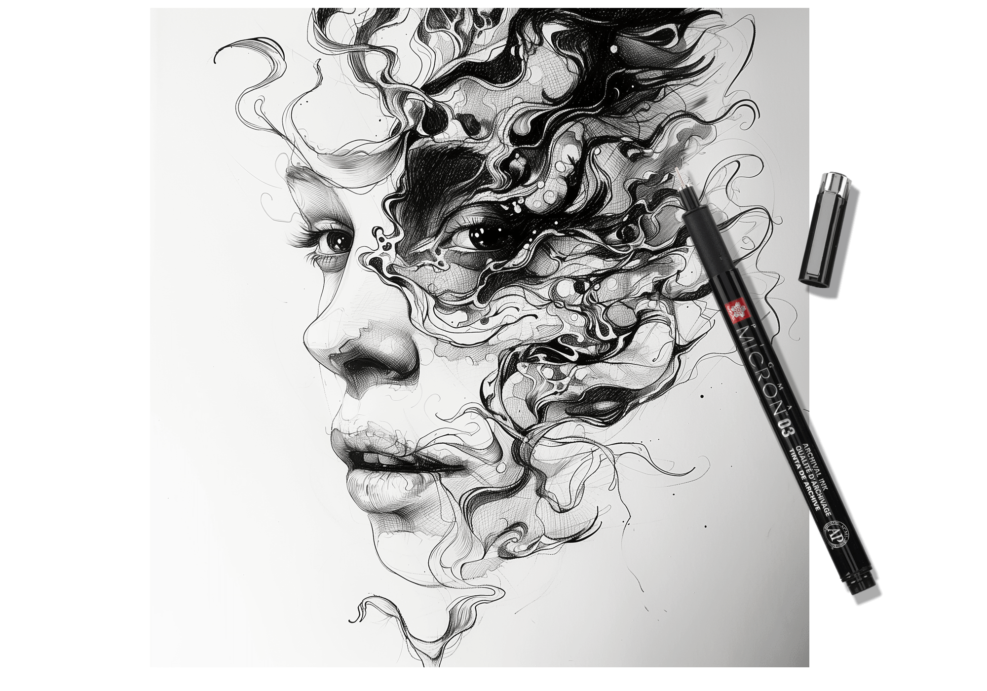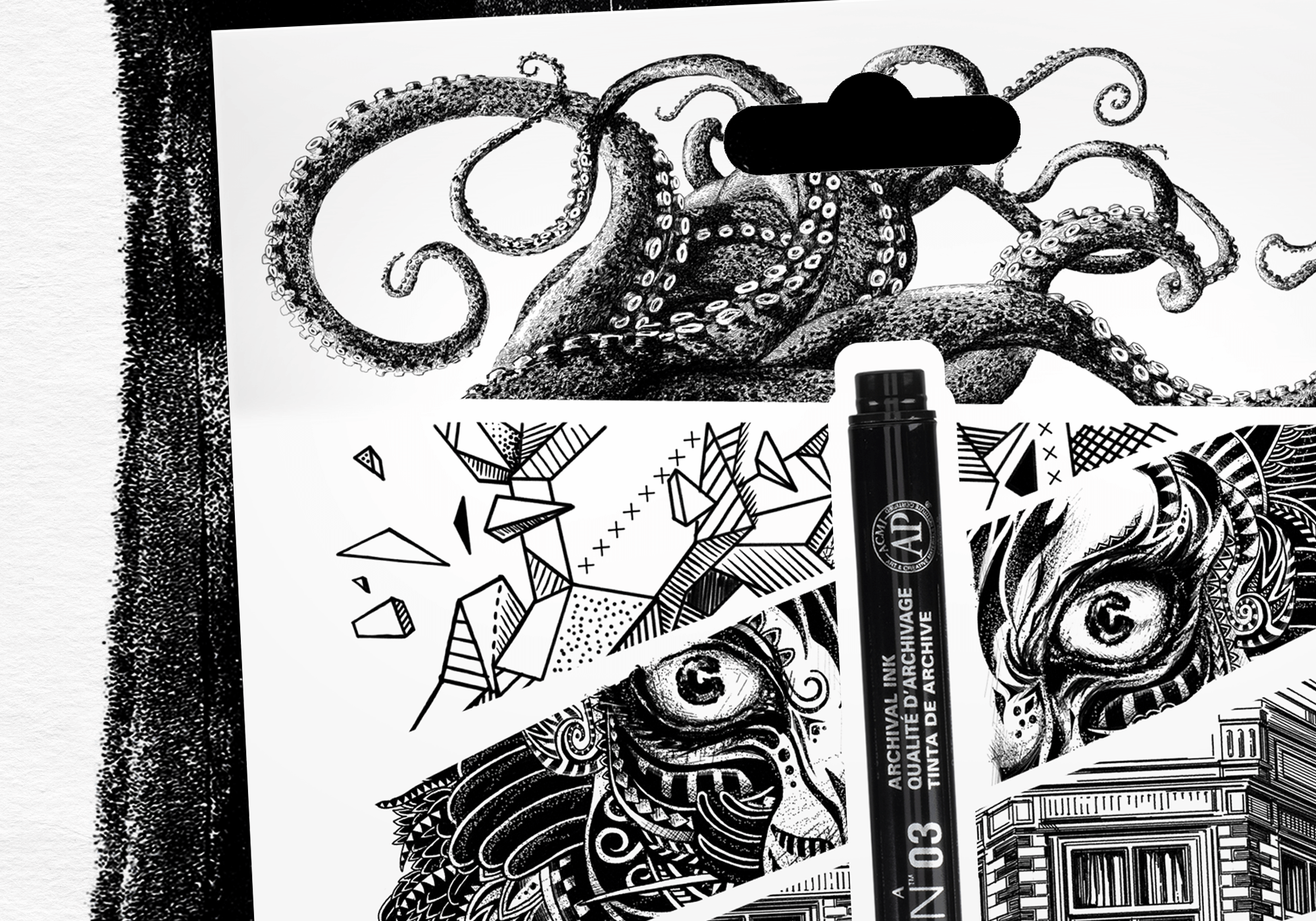 Door stijlen en technieken te combineren, ontstaat een rebels schouwspel, met de Micron fineliner iconisch in het midden afgebeeld.