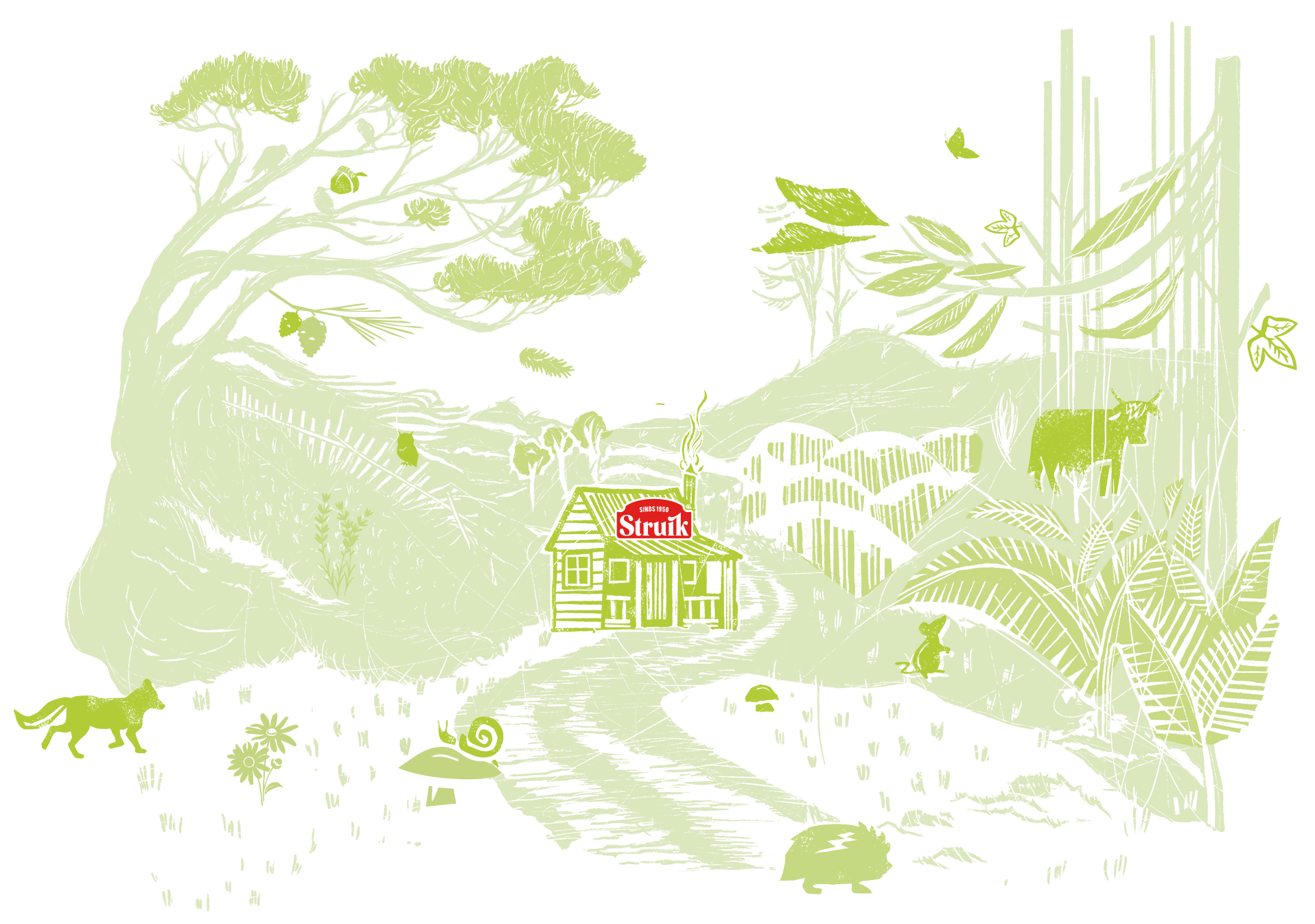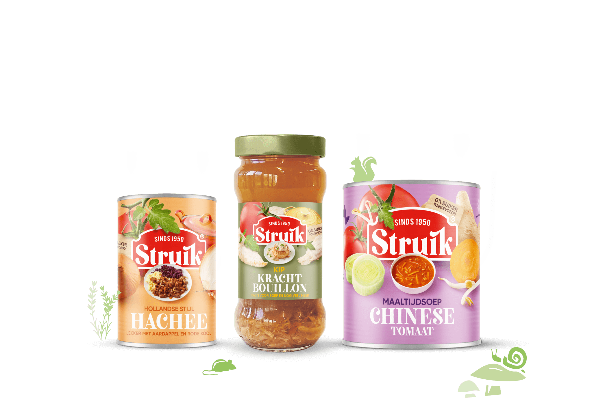 Twee generaties lang stond de fabriek van Struik met haar voeten in de klei van de Veluwe. Die Veluwse herkomst hebben wij door middel van illustraties op de verpakkingen tot leven gewekt.